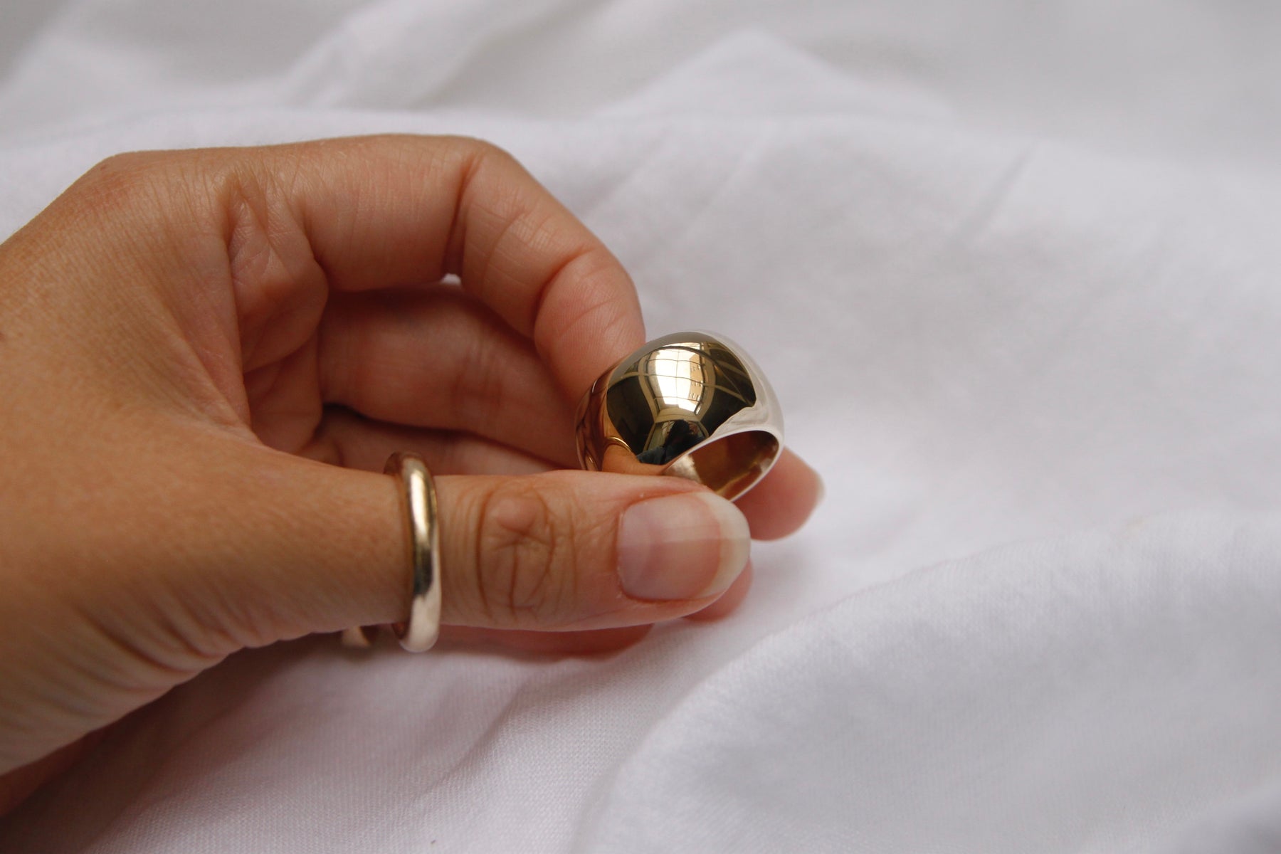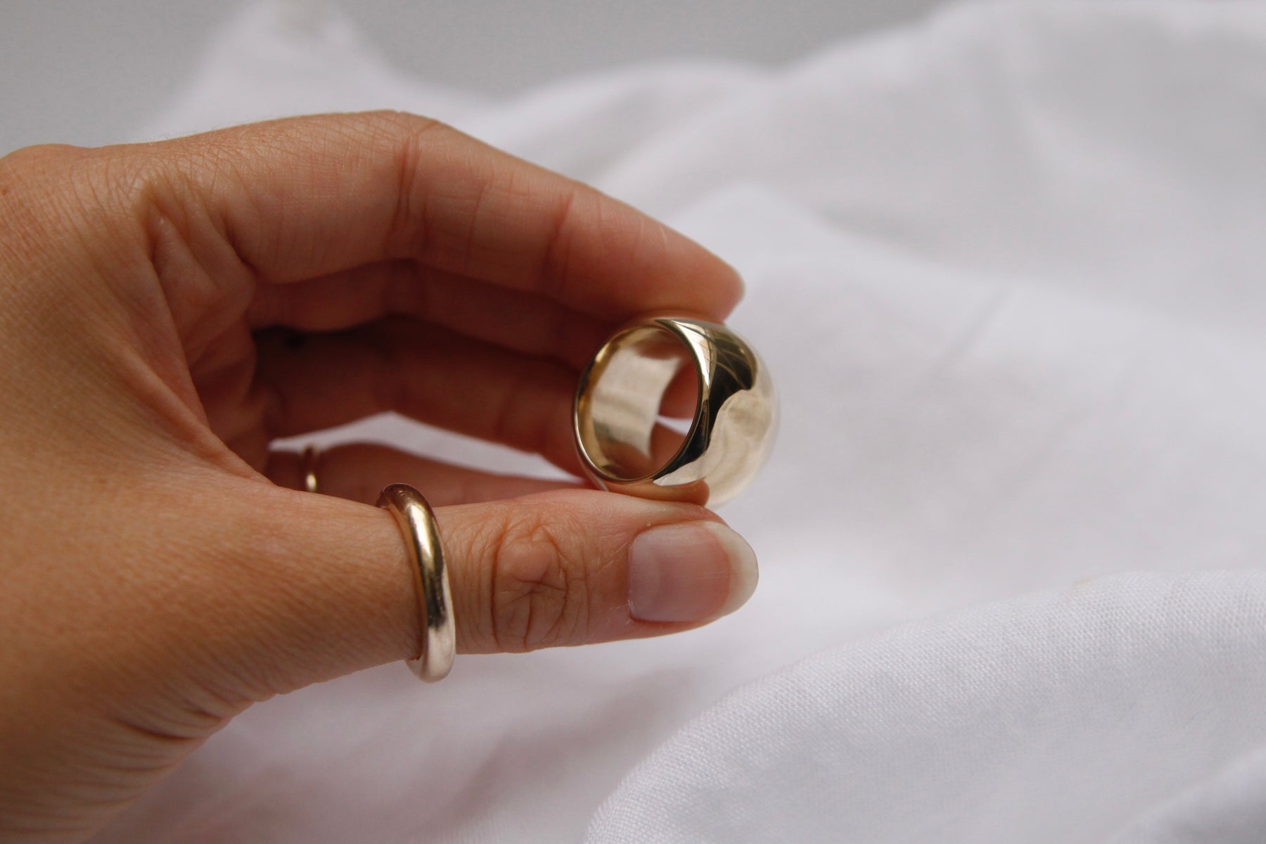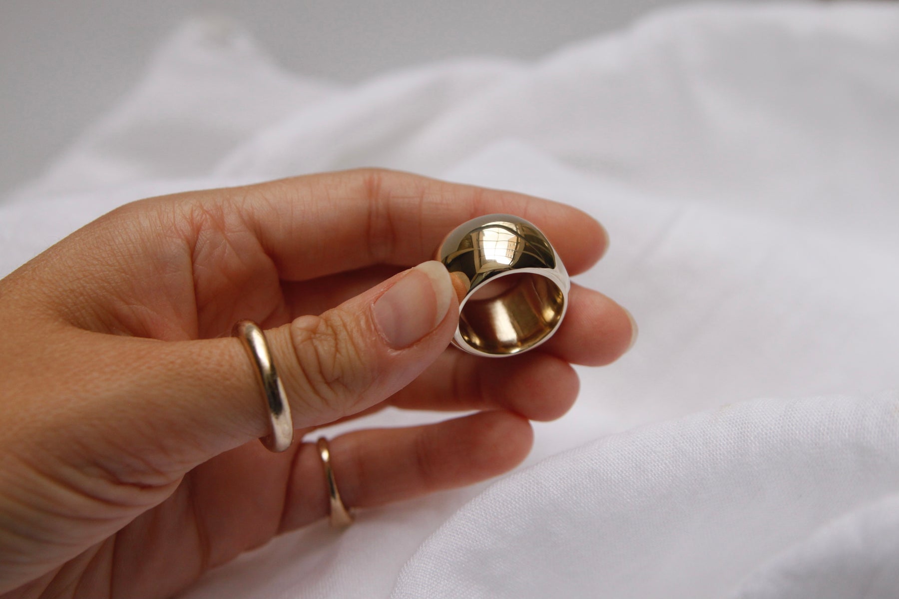 The Earth ring is the heaviest in the jac&Hugo collection. Its a unique statement piece available in sterling silver, or brass. Solid and weighty, it is polished to a mirrored finish.